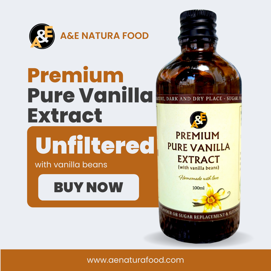 Experience the richness of real vanilla in every drop. Our Premium Pure Vanilla Extract (Unfiltered) is made from 100% organic Bourbon vanilla pods (Vanilla planifolia), Grade A, hand-selected for their exceptional aroma and quality. Grown using sustainable methods, these vanilla pods are free from artificial chemicals, pesticides, and synthetic fertilisers.